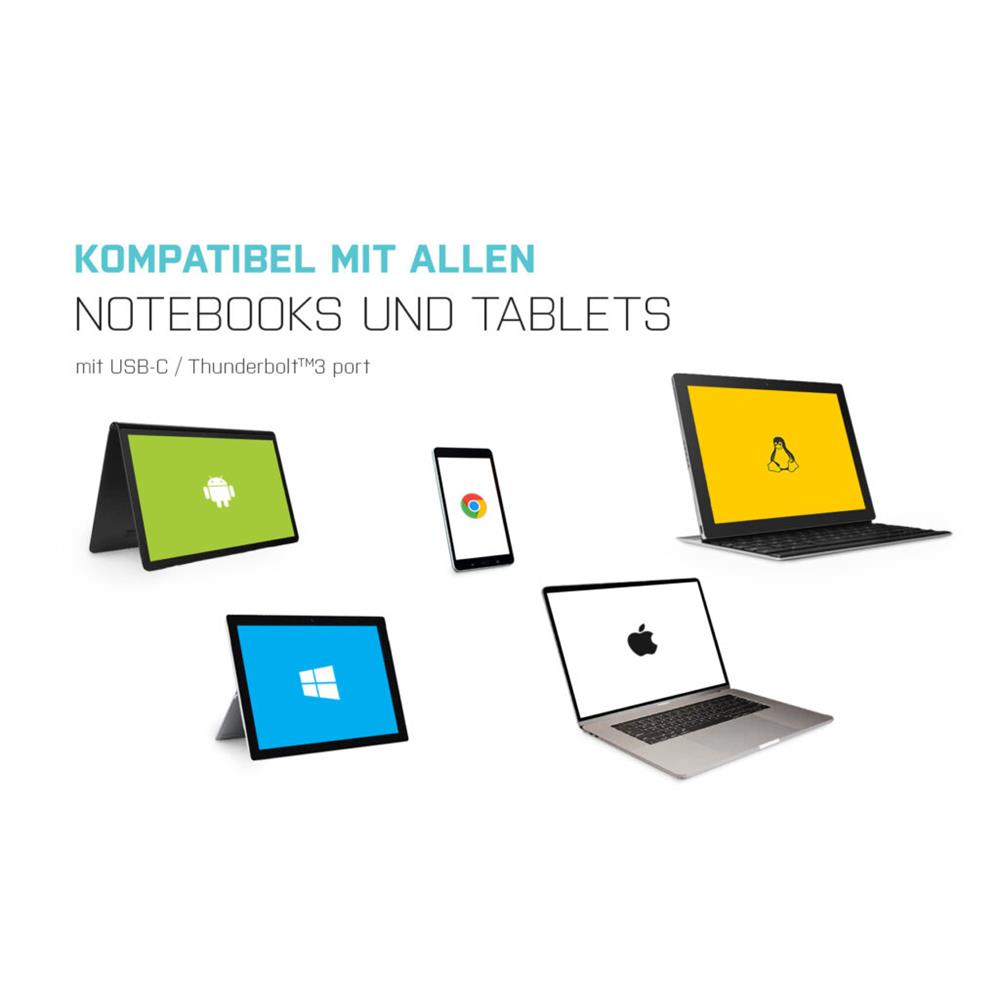 Die Dockingstation ist durch ein einziges Kabel (10 cm) über die USB-C oder Thunderbolt-3-Schnittstelle mit Ihrem PC zu verbinden und kann gleich darauf genutzt werden. Die Installation von Gerätetreibern erfolgt automatisch.